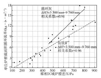 對循環流化床鍋爐,工程上通常采用爐膛差壓值間接反映鍋爐循環速率大小。由圖 9 可知針對鈦鐵礦床料而言,在稀相區高度段 ( 即 ΔH 3 =3 500 mm ~ 9 760 mm) 爐膛差壓與循環流率的一元線性相關系數 r = 0. 96,呈現線性關系。對循環灰床料而言,稀相區高度段 ( 即 ΔH 3 = 3 500 mm~ 9 760 mm) 爐膛差壓與循環流率的一元線性相關系數 r = 0. 91,呈現線性關系。整體趨勢上看,循環灰的爐膛差壓與循環流率一元線性關系與采用鈦鐵礦類似,且兩者一元線性的斜率和相關系數 r 存在一定差異,造成上述差異原因與床料顆粒從分離器出口物料損失速率、床料顆粒在爐膛內的氣/固比等因素差異有關 ( 注: 分離器出口幾乎沒有鈦鐵礦顆粒物料損失,而循環灰顆粒有不同程度物料損失) 。