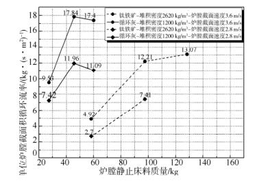 究,圖 10 給出了不同物性床料顆粒的爐膛靜止床料質量與循環流率關系圖。由圖可知,爐膛靜止床料質量約60kg,爐膛截面風速為2. 8 m/s 時,循環灰顆粒循環流率為 11. 09 kg/( s × m 2 ) 明顯高于鈦鐵礦顆粒的循環流率 2. 70 kg/( s × m 2 ) ; 爐膛截面風速為 3. 6 m/s 時,循環灰顆粒循環流率為17. 40 kg/( s × m 2 ) 明顯高于鈦鐵礦顆粒的循環流率4. 92 kg/( s × m 2 ) ,即循環灰的循環流率明顯