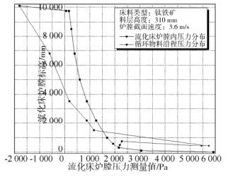 試驗結果表明,采用合適粒徑分布的鈦鐵礦為物料,能夠實現在循環流化床冷態試驗臺的正常運行,且爐膛內壓力分布趨勢與采用循環灰為物料的運行狀況規律一致。從壓力分布曲線可看出,鈦鐵礦比 CFB 鍋爐循環灰堆積密度大得多,其單位堆積厚度的床壓降比 CFB 鍋爐循環灰高,在流化狀態下,運行床壓與床料密度和堆積厚度有關。