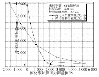 和數據采集系統實時采集壓力變化。試驗在爐膛空截面速度 3. 6 m/s 下,采用鈦鐵礦 ( 靜止床料厚度 310 mm,床料量 97. 5kg) 和 CFB 鍋爐循環灰 ( 靜止床料厚度 490 mm,床料量60 kg) 的壓力分布趨勢如圖3 和圖4 所示。