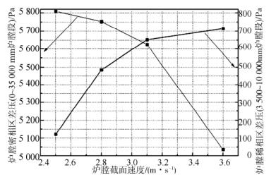 在試驗截面速度范圍內 ( 2. 5 m/s → 3. 6 m/s) ,爐膛密相區 ( h = 0 ~ 3 500 mm) 和稀相區 ( h =3 500 mm ~10 000 mm) 壓降與截面速度的關系曲線見圖 6,由曲線可知隨著截面速度增加爐膛密相區的壓差呈現下降趨勢 ( 5 800Pa → 5 035 Pa) ,爐膛稀相區差壓值呈現上升趨勢 ( 122Pa → 715 Pa) ,表明,隨著截面速度升高,爐膛密相區床料充氣膨脹更強烈,氣/固比升高,而稀相區壓差隨截面速度的升高而升高,說明氣體對鈦鐵礦顆粒的攜帶能力增強。