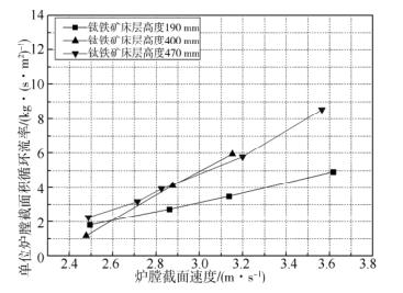 ( 3) 本次試驗鈦鐵礦和循環灰兩種顆粒均隨著爐膛截面流速的升高,單位爐膛截面的循環流率增大; 在相同物料量和流化速度下,循環灰的循環流率明顯高于鈦鐵礦的循環流率。
