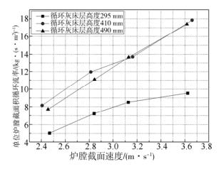 圖 7 給出采用鈦鐵礦為試驗床料,靜止爐膛高度分別為190 mm、400 mm、470 mm ( 即對應床料量分別 58. 2 kg、128. 3 kg、153. 2 kg) ,不同截面速度與循環速率的趨勢圖。由圖可知,對不同床料量鈦鐵礦而言,隨著爐膛截面流速的升高,單位爐膛截面的循環流率增大。圖 8 給出采用 600MW 超臨界 CFB 鍋爐燃煤機組的循環灰為試驗床料,靜止爐膛高度分別為 295 mm、410 mm、490mm ( 即對應床料量分別 27. 3 kg、45. 7 kg、60. 0kg) ,不同截面速度與循環速率的趨勢圖。由圖可知,不同靜止爐膛高度的循環灰循環流率與爐膛截面速度均呈現線性關系。