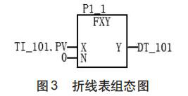 圖2中,X表示某一溫度占總量程的百分比,Y表示某一溫度對應的密度。假設溫度檢測儀表的測量范圍為0—50℃,3℃為量程的6%,其對應的數值為0.06.按照表1 所示 3℃時,其對應密度為 0.634451Kg/L。故輸入 X 為0.06時,對應的密度Y為0.63445.把液氨溫度(0-30℃)分成 10 段(0℃,3℃,6℃…30℃),其對應為量程的 0%,6%…60%轉換為0.1.0.06…06.再按上述方法填寫對應的密度。即可得序號為0的折線表二維折線表。在生成折線表后,通過控制算法組態完成折線表組態如圖 3.圖 3 中 X 端輸入位號 TI_101.PV 表示液氨溫度傳感器在DCS主控卡中對應輸入映像寄存單元,0折線表序號,DT_101為自定義變量。完成折線表組態后,DCS將采集到液氨溫度的動態數據進行線性插值處理后的結果(密度)保存到自定義變量DT_101中。
