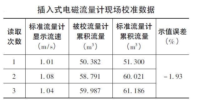 在插入式電磁流量計中設置實驗室可追溯性的儀器系數,并在現場校準DN800電磁流量計。 流量設定為1.0m / s,儀器系數K設定為1.3225。 首先,在現場管道上打一個在線孔,然后將插入式電磁流量計插入管道中,以確保探頭的安裝方向和插入深度與實驗室可追溯性一致。 最后,開始在線校準,以記錄標準流量計和校準后的流量計在一段時間內的累積流量,并計算出指示值的誤差。 表中顯示了現場校準數據。