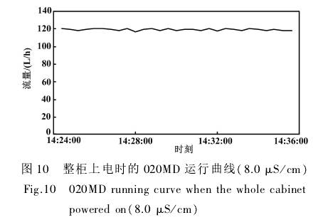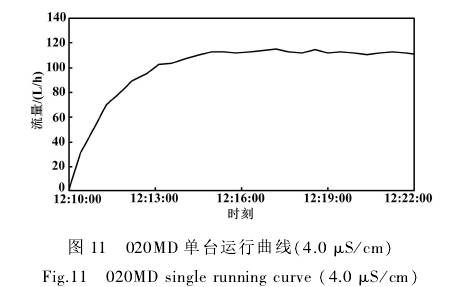 由上可知,流體電導率的高低對采集的信號強度有直接影響。 當電導率低時,來自電極的信號反饋較弱,干擾的影響更明顯。 低電導率的流量測量對信號采集有更高的要求。 壽命終止時測得的介電導率約為4.0μs/ cm。 在這種情況下,電導率降低到4.0μs/ cm。 運行一段時間后,觀察到020MD單機運行穩定。 操作曲線如圖11所示。