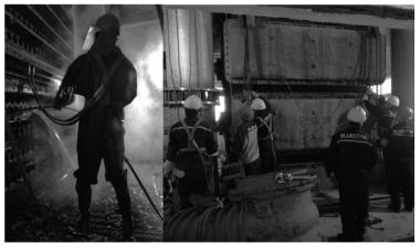 堿廠設備在以往的檢修清洗經歷中,檢修單位都基本都采用 20% 的 HCl 溶液對鈦管進行化學清洗,施工安全風險大,設備腐蝕嚴重,除垢清洗效果不理想。本次單法蘭液位計鈦管除垢清洗,采用高壓水清洗工藝對單法蘭液位計內鈦管進行清洗。按照業主方要求對 15 號塔先用高壓水工藝進行施工,施工工序為 :碳化單塔系統停車—置換、隔離—搭建清洗施工操作平臺—割斷、剝離水箱蓋螺栓—拆卸水箱蓋—鈦管高壓水清洗—驗收及復位。圖 2 所示水箱拆卸及高壓水清洗操作。