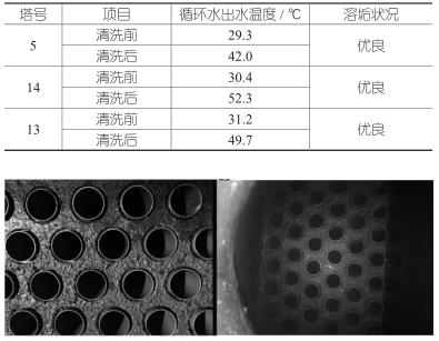 (1)控制鈦管內清洗流體流速應在 0.3~0.8 m/s 之間 ;(2)加藥溫度應在 35~38 ℃ ;清洗過程控制溫度在45~52 ℃之間,清洗液溫度嚴禁超過 55 ℃ ;(3)清洗時間控制在 12 h 之內,但應盡量縮短清洗時間,可通過觀察鈦管表面清洗程度來判斷非常佳結束節點 ;(4)不參與清洗的設備部件,如調節閥、過濾器、壓力表、溫度計等測試、測量儀表均應拆除或抽芯。不參與清洗系統要確認能夠有效隔離 ;(5)酸洗結束后應由下而上先進行水頂酸的沖洗,以防止鈦管上部粘粘懸浮物體而影響清洗效果,待沖洗出水較澄清時可反向沖洗 ;(6)為有效減少氣阻,應設置排氣放空閥 ;應對清洗過程有效檢測,尤其對鐵離子濃度適時監測,若測得的 Fe 3+ 離子濃度大于 1 000 mg/L,應及時添加 Fe 離子還原劑(如Na 2 SO 3 等)或置換部分酸洗液,使 Fe 3+ 離子濃度小于500 mg/L ;確保化學清洗時,水箱基體及鈦管的腐蝕速率應小于國家標準規定以下 ;(7)不同的單塔內鈦管因工況不同而結垢程度不一,應事前了解或直接開蓋檢查鈦管結垢情況,進而調節清洗工藝或清洗控制參數,達到清洗徹底而不過洗的效果 ;(8)嚴格控制酸洗主劑濃度,酸濃度過高,會產生大量氫氣,酸霧嚴重,影響環境及損害操作人員的健康。由于水垢含硫,清洗時會產生 H 2 S 氣體,要求清洗泵站及設備區域進行有毒有害氣體的監測,防止人員中毒事件 ;另外酸洗會產生大量氫氣等可燃性氣體,需加強現場管理,防止發生意外。