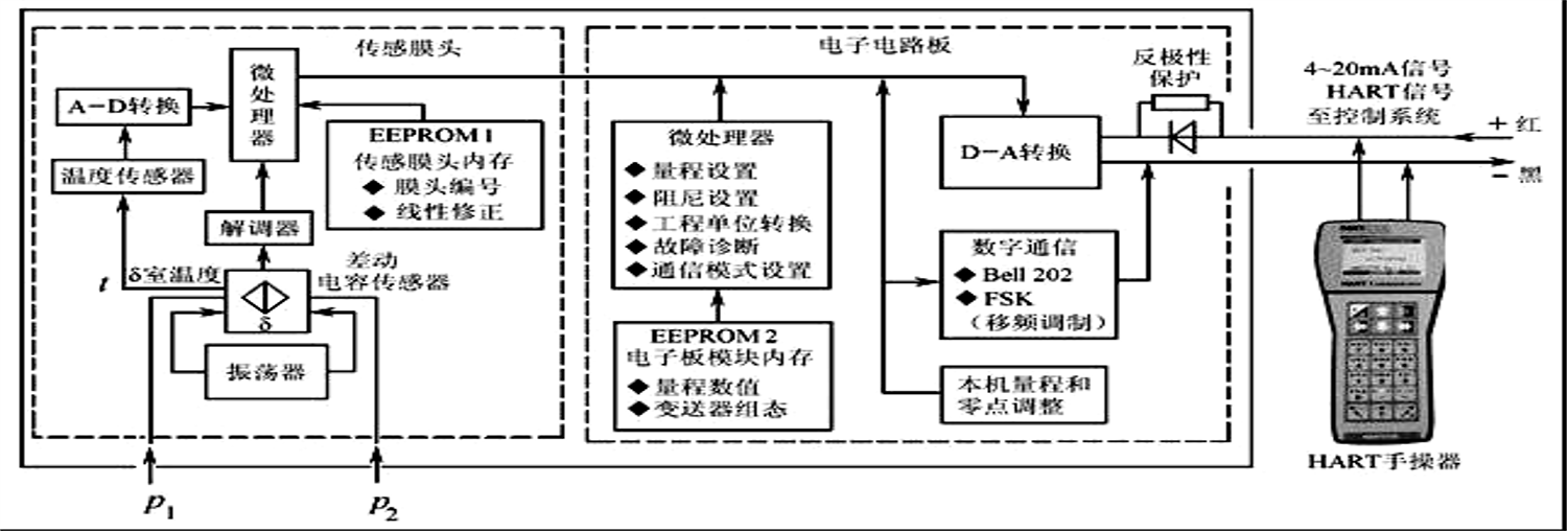 智能差壓變送器的工作原理框圖帶有液晶顯示器,與手持終端配合,可以在現場變送器的信號端子上,就地設定零點、量程;也可以在遠離現場的控制室中,或遠離危險的地方,將智能手持終端接到某個變送器的信號線上,進行遠程組態、測量范圍變更、變送器校準、故障自診斷。