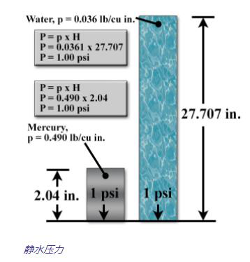 靜水壓力是一列液體底部由每單位面積的靜水壓力產生的壓力,這也可以稱其為壓頭或壓頭壓力,但是通常都被稱為流體的高度,例如水柱英寸,水銀英寸或水英尺。該測量取決于液體密度并且與容器的形狀無關。這是基于壓力等于密度乘以液體高度的特性。