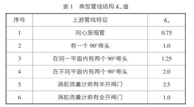 其中:μ是管道的內摩擦系數; Kn是渦流速度比,由渦輪流量計的上游管道特性確定。 表1列出了典型管線結構的Kn值。
