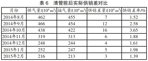 A子站的渦輪流量計距離壓縮站(由往復式壓縮機加壓)不到7公里,該壓縮站非常靠近上游,并且該子站的技術布局緊湊。根據現場測量,流量計的上游直管段的長度約為DN6(DN是渦輪流量計的口徑,mm),下游直管段的長度約為4DN。此外,沿7公里管道的崎terrain地形,加上大量的煤層氣(CBM)大量水,很容易在低洼地區形成液體積聚,并且液體積聚還會引起脈動流。 2014年8月至2014年10月,當下游公司發現積極的供銷缺口持續增加時,它對變電站A和變電站B的渦輪流量計進行了校準,但校準結果全部合格。隨后,下游公司于2014年11月5日至7日對A到B輸電站的管道進行了清管作業,共清除了23噸污水中的雜質。清管完成后,正供與銷之間的差異顯著減小。表6顯示了清管前后供求之間的實際差異。